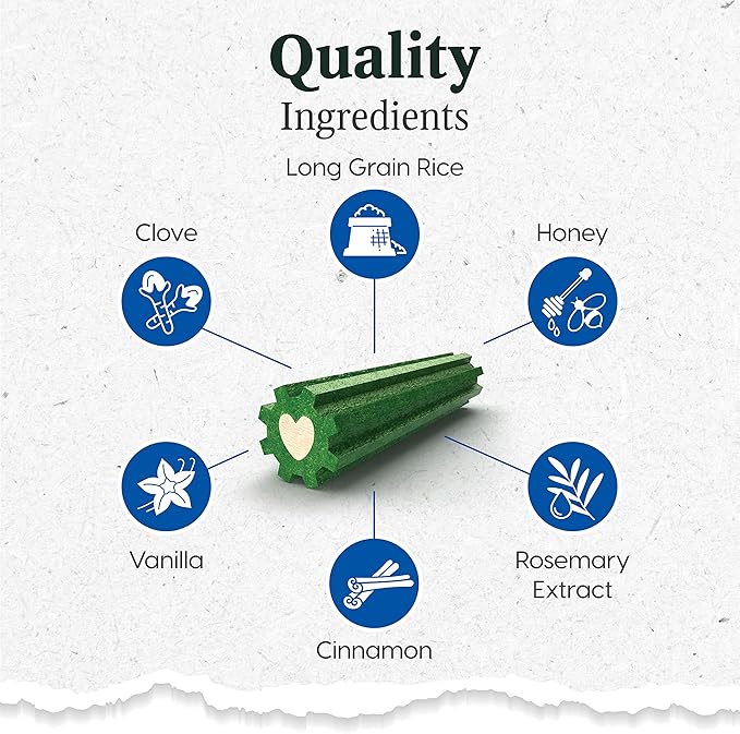 - Natural dog breath freshener: No more stinky dog breath; in addition to dog teeth cleaning, our chews also freshen your pup’s breath using natural ingredients like alfalfa, cinnamon, vanilla and clove