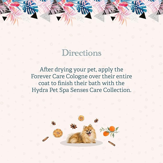 - PAMPER YOUR PET: The Hydra Senses Forever Care Pet Cologne is the perfect finishing touch to a grooming session or bath. This fragrant spray has a lovely scent and is suitable for dogs and cats.