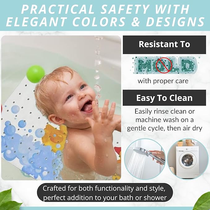 - EASY TO CLEAN Crafted from durable, easy-to-clean, and safe materials, this bath mat simplifies maintenance. Rinse it in the shower or tub, or toss it in the washing machine for a quick and convenient clean.