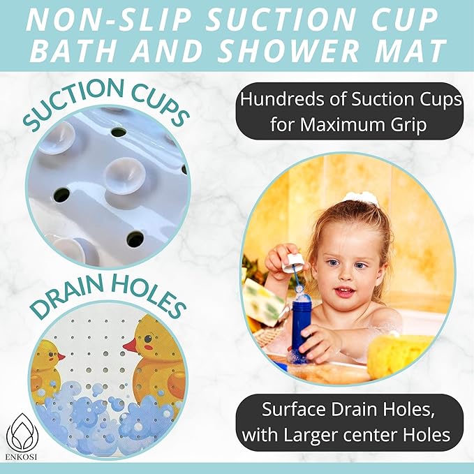 ENKOSI Kids Bath Mat 40x16 – Non-Slip Tub Bathmat Duck Print with Suction Cups & Drain Holes for Safe, Fun Bathtub Bath Time for Toddlers (40x16 Duck)