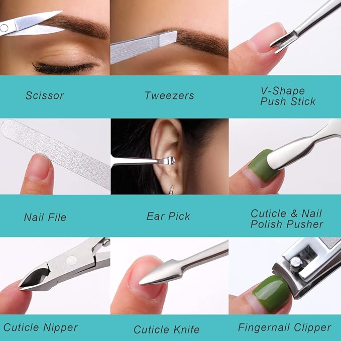 - 【Mani Pedi Kit with Luxury Fashion Case】 Our Stainless Steel Manicure Kit with a blue gorgeous leather case makes it a fashionable and popular gift for your relatives, friends, parents, and the husband. Lightweight and portable travel essentials can offer exceptional foot, hand, and facial grooming tools