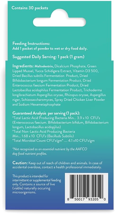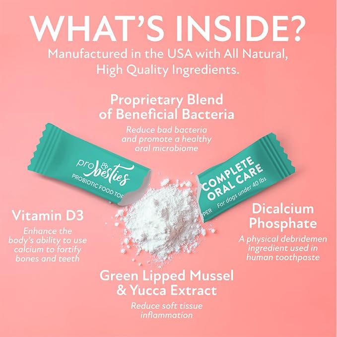 - Simple & Convenient - 30 convenient, pre-measured, single dose packets means no messy, smelly scoops. Just sprinkle one packet on your dog’s food each day. ProBesties Complete Oral Care can be used with wet or dry food.