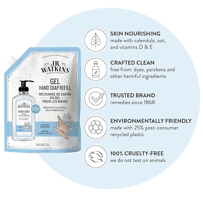 - SKIN NOURISHING: Give your hands a gentle yet thorough clean without dryness or irritation, J.R. Watkins hand soaps leave your skin feeling smooth and beautifully cleansed, all the more reason to take advantage of our handsoap refill products.