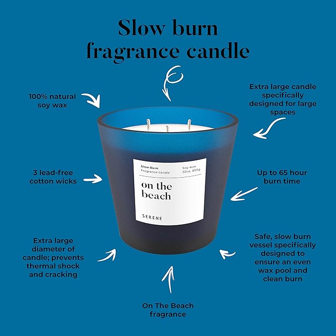 Hidden Label Large Scented Candle, On The Beach, 30oz 3 Wick Huge Candle, Serene Collection Slow Burn Natural Soy Candles for Home Scented