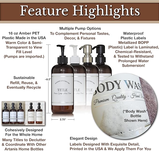 Amber PET Plastic Refillable Shampoo Pump Bottle Dispenser with White Plastic Pump, 16 oz Bathroom Bottle with Chrome Accent Waterproof Modern Apothecary Label, Reusable Shower Container