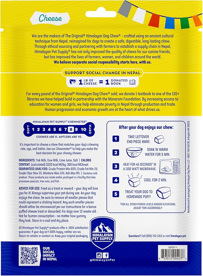 - ORIGINAL CHEESE FLAVOR: Included is a mix of four large & extra large 3.3 oz original cheese flavored Himalayan yak cheese sticks ideal for dogs 65 pounds and smaller, not for dogs younger than 12 weeks.