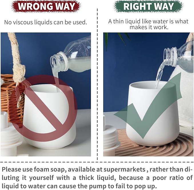 - Multi-Use: White ceramic soap dispenser used for foaming soap filler, If you use viscous liquids such as liquid soap, dish soap, or shampoos, it's recommended to dilute them with water to achieve a rich lather; refillable for continuous use