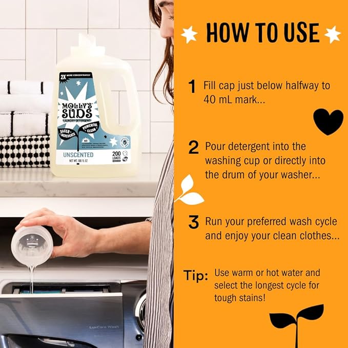 - Developed by a pediatric nurse & mom and made with simple, effective ingredients, Molly's Suds harnesses the power of plant-based surfactants and active enzymes to deeply penetrate fibers, removing soil, dirt, oil, and stains with ease.