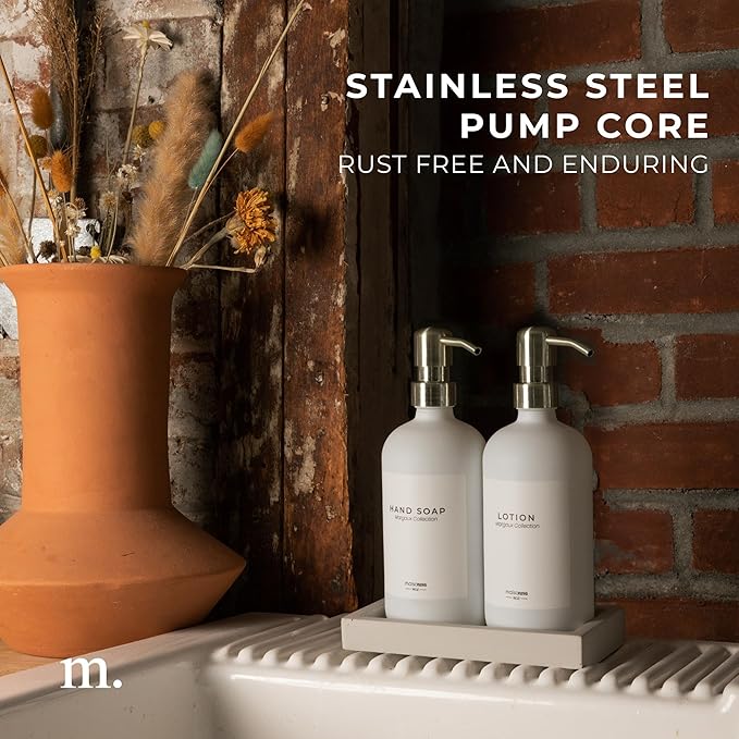 - Quality Materials: Designed in the USA and made with ISO14001 environmental standard these dispensers are crafted from premium quality glass and featuring a robust concrete tray, these soap dispensers are built to last. The waterproof labels are designed to withstand daily use, ensuring that your set remains both functional and beautiful over time.