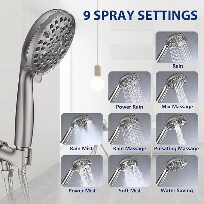- Premium Material: Hand held shower has brushed nickel plated durable ABS material, high strength 304 stainless steel hose, anti-clog rub-clean nozzles for easy cleaning and prevent lime buildup