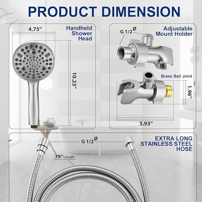 - Premium Material: Hand held shower has chrome plated durable ABS material, high strength 304 stainless steel hose, anti-clog rub-clean nozzles for easy cleaning and prevent lime buildup