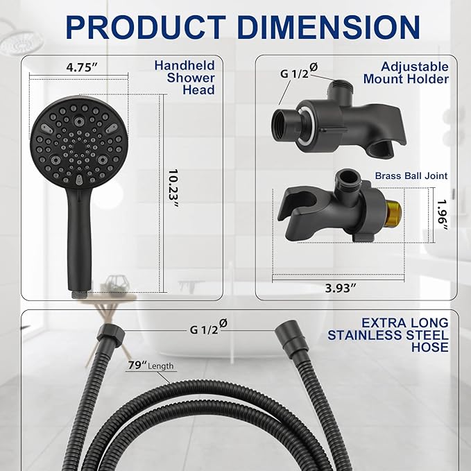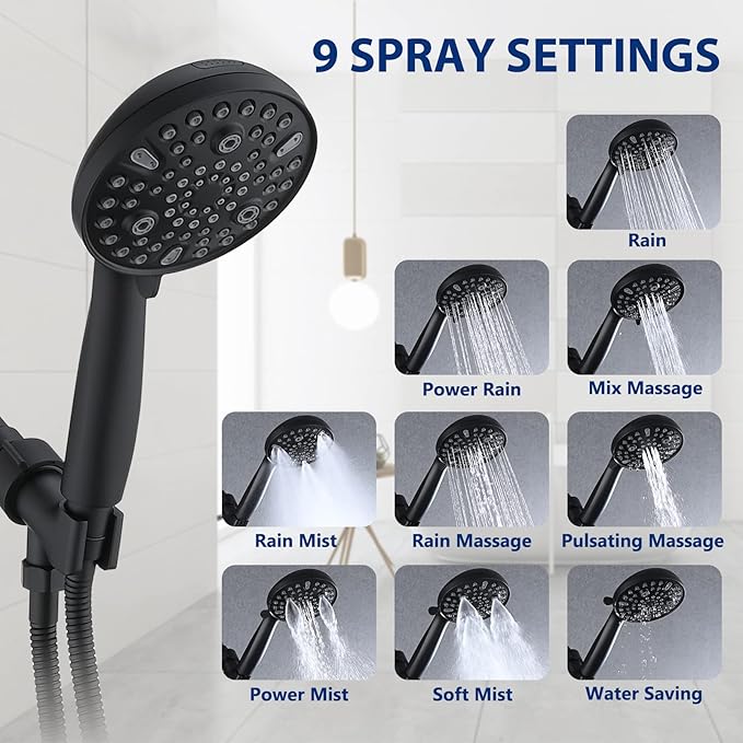 - Premium Material: Hand held shower has matte black plated durable ABS material, high strength 304 stainless steel hose, anti-clog rub-clean nozzles for easy cleaning and prevent lime buildup