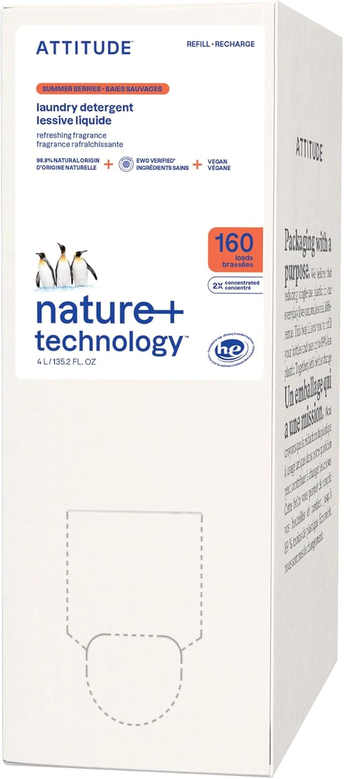 ATTITUDE Liquid Laundry Detergent Refill, EWG Verified, HE Compatible, Plant-Based & Vegan, Natural Laundry Soap, Summer Berries Scent, 160 Loads, 135.26 Fl Oz