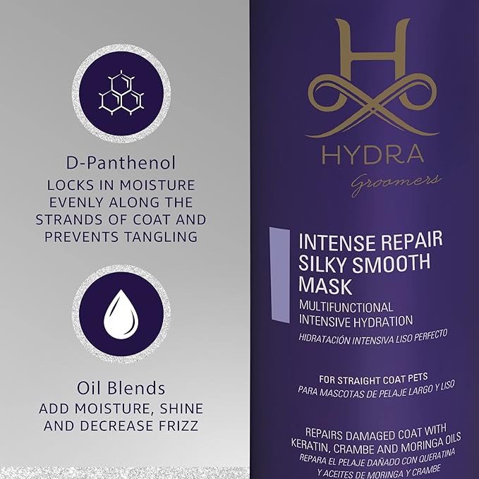 - CAT & DOG CREAM: The Hydra Intense Repair Silky-Smooth Mask promotes coat reconstruction while adding softness. Its premium blend includes creatine, moringa and crambe oil, D-panthenol, and keratin for long-lasting moisture and improved coat texture.
