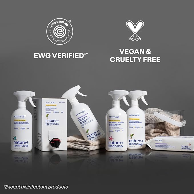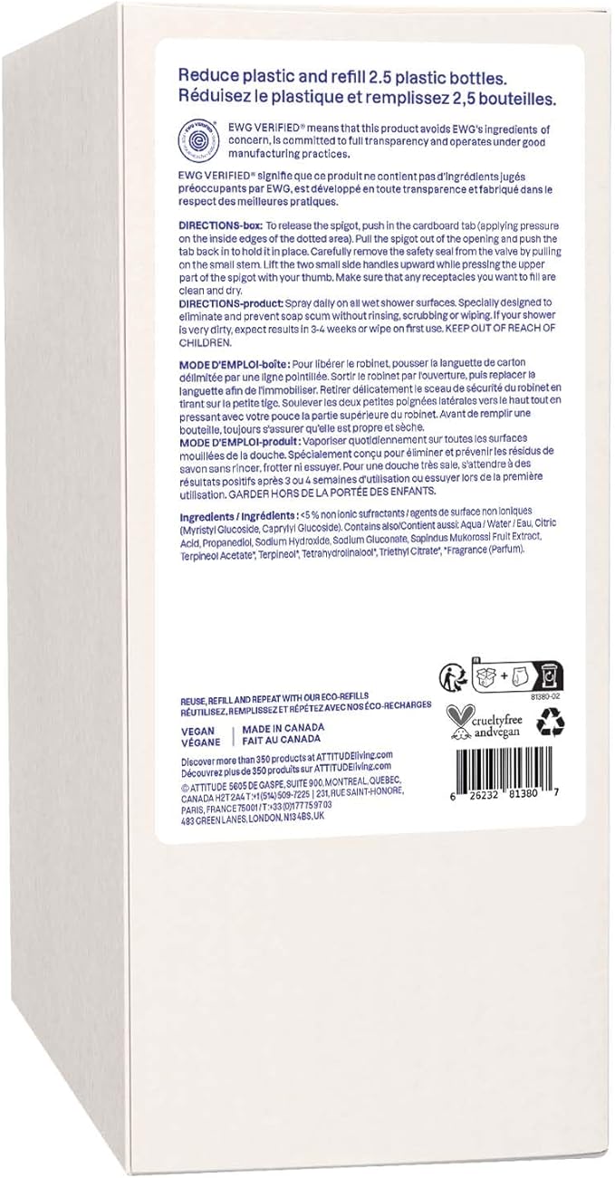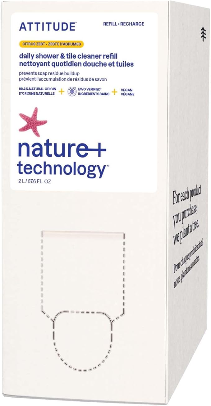 ATTITUDE Shower & Tile Cleaner Refill, EWG Verified, Plant-Based & Vegan Bathroom Spray, Removes Soap Scum & Grime, Citrus Zest Scent, 67.6 Fl Oz