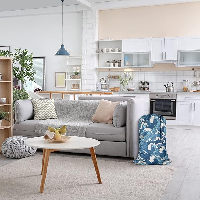 Swono Wave Large Collapsible Laundry Bag - Surf Sea Cartoon Blue White Foldable Hamper, Football Grid Oxford Cloth, Holds 4 Loads, Ocean Theme