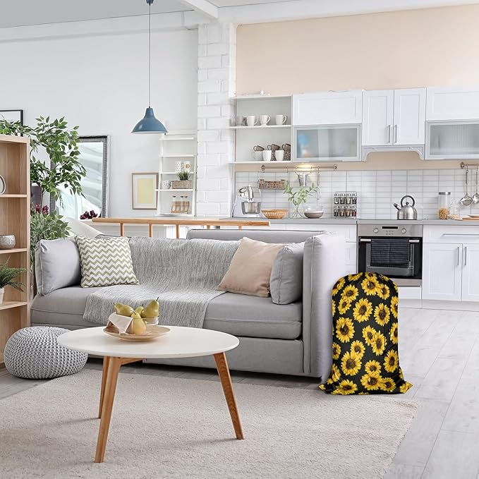 Swono Sunflowers Large Capacity Laundry Hamper Basket Classic Floral Leaf Romantic Bouquet Blossom Storage Baskets for Bedroom, Bathroom, Dorm, Washing Room, Machine Washable, Black Yellow