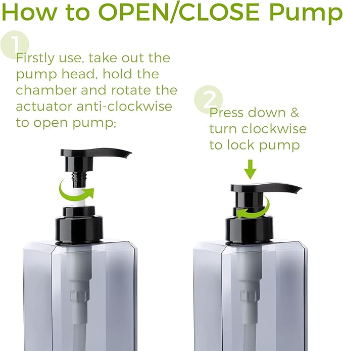 - Easy to use - The bottle feature with wide bottle caliber, convenient for filling the liquid into the pump lotion containers.Locking lotion pump preventing the lotion from leaking, press down and twist clockwise to close, twist anti-clockwise to open and use.The plastic pressure pump head, just lightly press to use, bring you nice feeling of use.