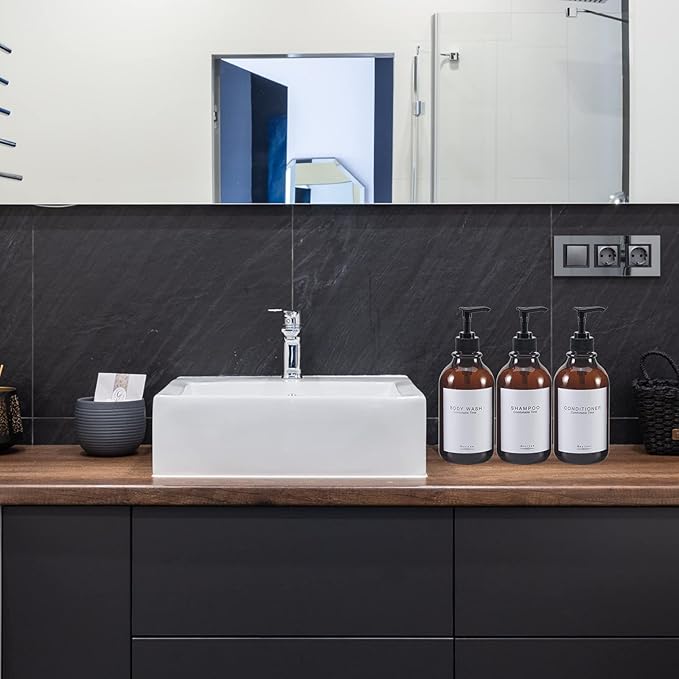 - QUALITY MATERIALS:This shampoo and conditioner dispenser is Carefully design, environmental standard, Reinforced and thickened plastic bottles, high quality pumps and pump cores, Reinforced 55g PET plastic bottle, white waterproof label, not afraid of wet environment, durable. This soap applicator will make your home more organized, beautify your bathroom or kitchen, and bring a good mood to your family.