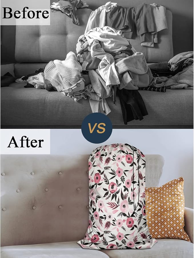 Swono Watercolor Sketch Poppy Large Laundry Bag Washable Large Dirty Clothes, Leaf Repeating Pattern Drawstring Organizer Bag, Fit Hamper Basket Camp Travel Home Dorm, Pink Black