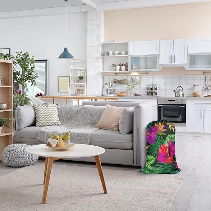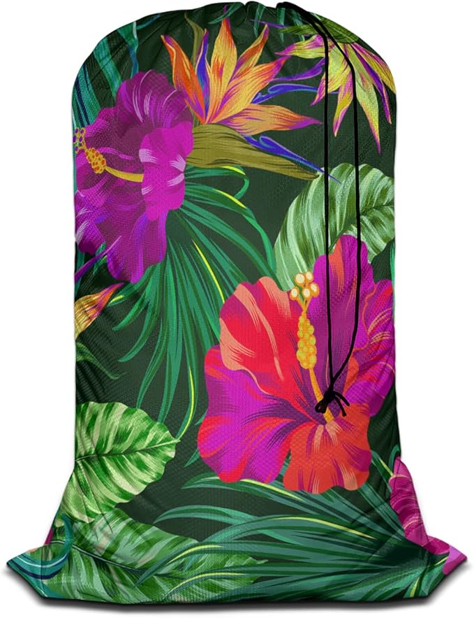 Swono Tropical Flowers Drawstring Closure Dirty Clothes Bag Organizer, Heavy Duty Large Laundry Bag, Floral Pattern Botanical Hibiscus Palm Leaf Bird Summer Rip-Stop Bags for Camp Travel