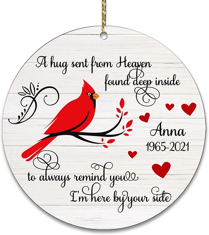 HYTURTLE Personalized Memorial Sympathy Christmas Ornament Tree Decor Gifts for Family Loss of Loved One Mom Dad in Heaven - Cardinal Hug Heaven Side Custom Name Circle Ornament