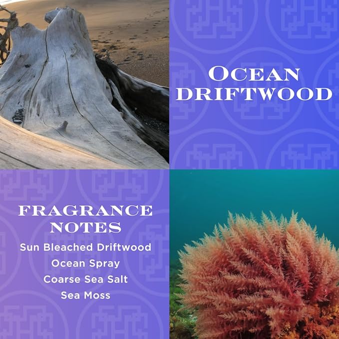 - OCEAN DRIFTWOOD: Fragrant driftwood that has been bleached by the sun and sprayed by the ocean mist is combined with coarse sea salt and sea moss creating an aromatic moment that is clean and fresh.
