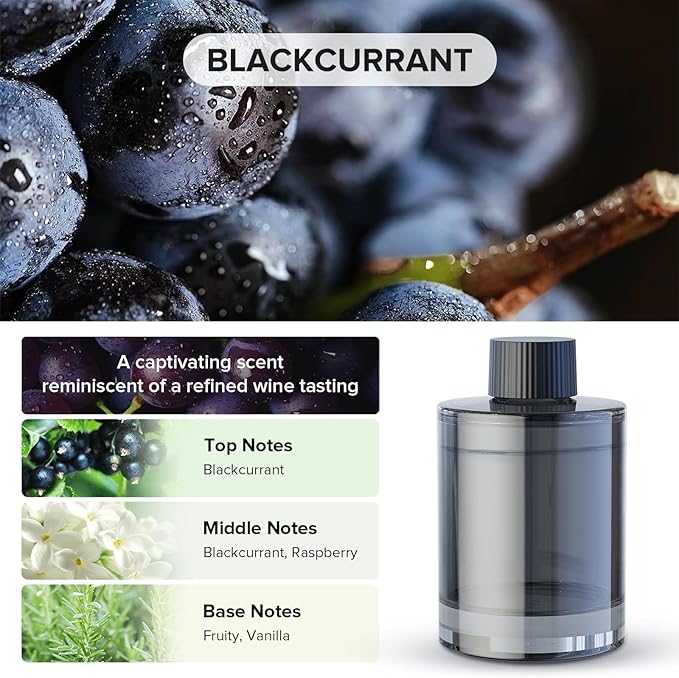 - 【135ml Black Currant Noir Scent】A rich blackcurrant and red wine aroma, with notes of ripe fruit and subtle hints of herbs, emanates an elegant and complex scent, as if surrounded by a sophisticated wine tasting environment. It offers 6 different natural scent options to choose from, including lemon, lavender, and orange, suitable for different tastes and occasions