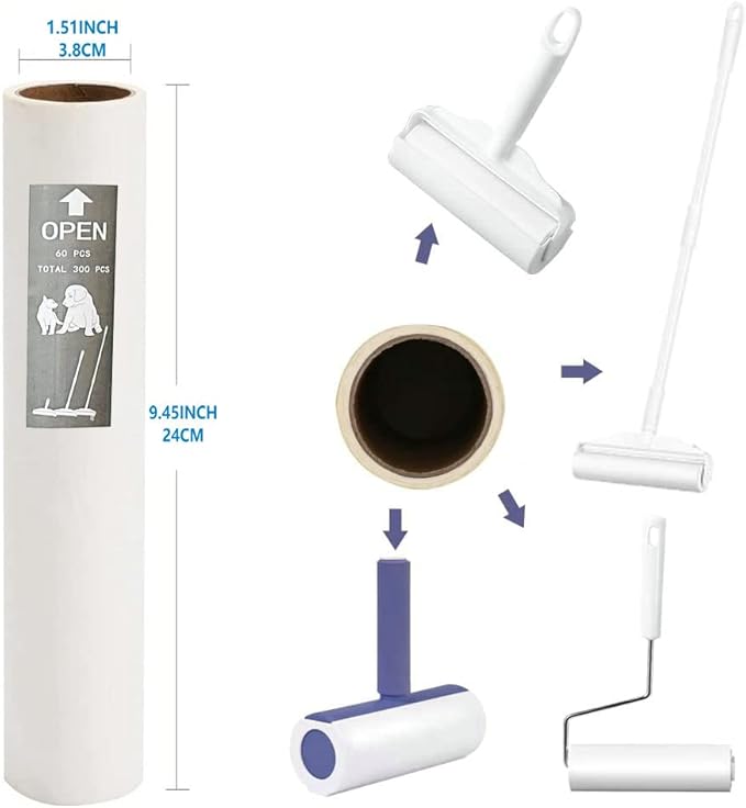 - This 5 packs total 300 sheets 9.45 inches universal roller refill is perfect for cleanup Pet's hairs, car's interior, floor, sofa, pillow, bedding and carpet or rugs