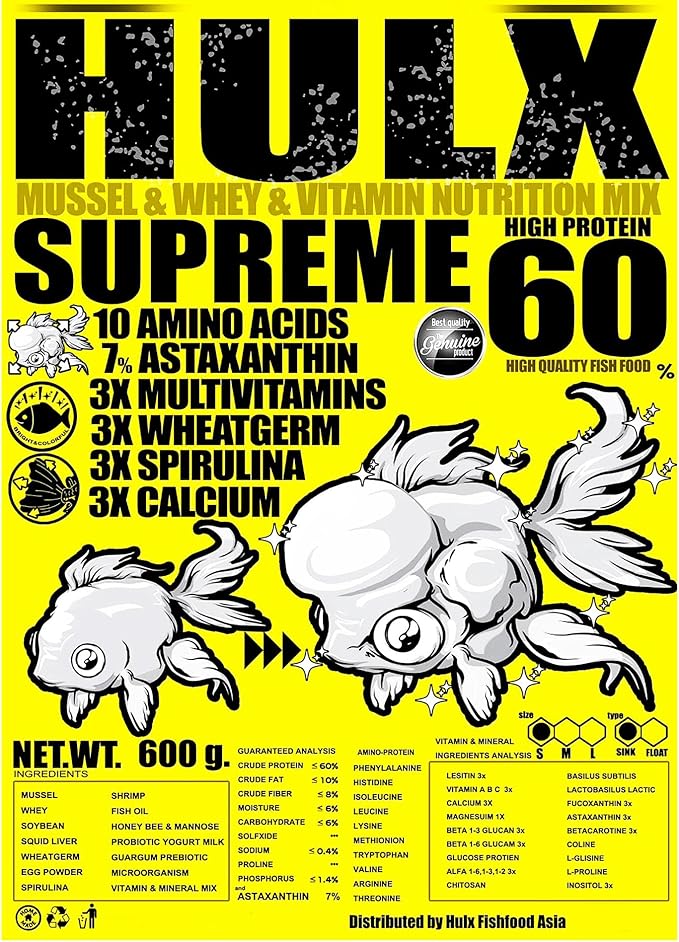 - PROTEIN RICH FISH FOOD : High Quality Goldfish Food For Muscle & Mass Gain, Mussel & Whey & Vitamin Nutrition Mix, Supreme 60, 7% Astaxanthin HEALHY FISH FOOD: HULX You can see the difference in just 15 days of usage. From thin Body to Fat & Big Muscle Body, Good Health, Very Fast Growth up more 2 inch (5.5 cm.) in just 30 days. It enhances the color Beautifully & make them Shine.