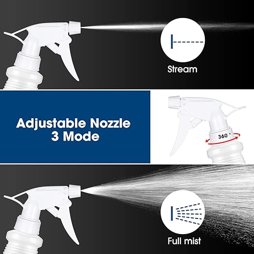 - Adjustable Nozzles: the 16 oz refillable spray bottles have 3 different modes of adjustable nozzles, you can easily adjust easily switch from mist, stream or to off; The trigger can be pulled and squeezed easily, which can give you comfortable grip and reduce finger fatigue