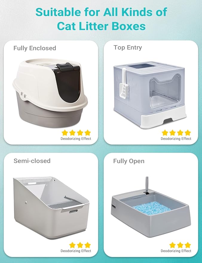 - Quiet and Multiplace can be used: Design for small place, this kitty litter deodorizer can be sticked on the smell small area you want to deodorizer, such as cat litter boxes, pet carpet, shoe box, bathroom, wardrobe, garbage can, other animals' living area etc. The working sound emitted by cat deodorizer is below 20db so that will not disturb you and your cats