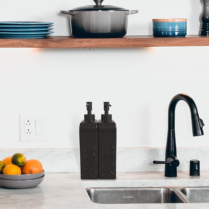 - DIMENSIONS: Hands measure 2.2 x 3.4 x8.7 inches, Dishes measure 1.8 x 3.4 x 8.7 inches. This set includes a HANDES dispenser, a DISHES dispenser, and a silicone funnel.