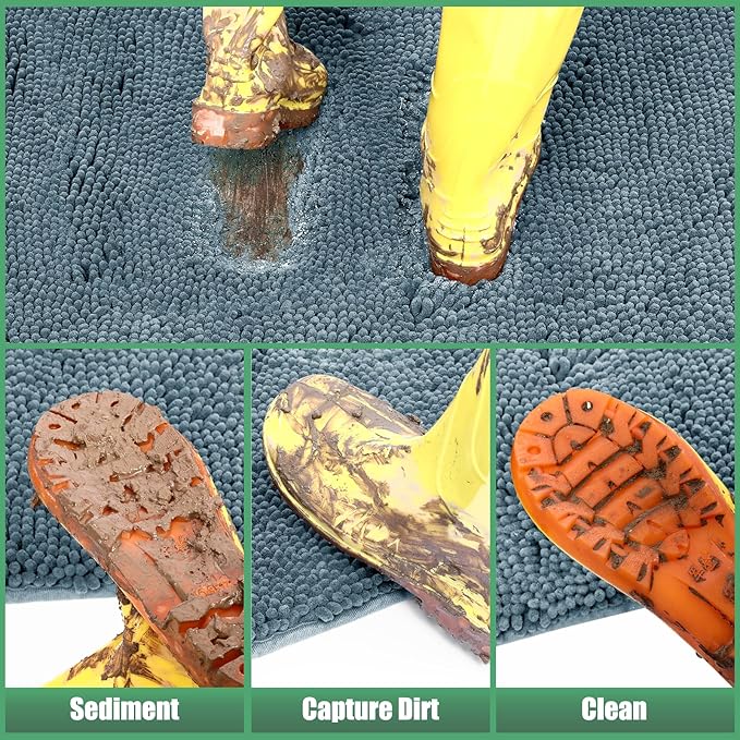 - 【Powerful Dirt Scraping and Moisture Locking】 This chenille doormat outperforms ordinary options in trapping dirt and moisture, stopping tracked-in mud, rainwater, and debris from ruining your floors. It shines even brighter in winter! Step on doormat, and the textured, dense surface instantly scrapes off dirt and snow from shoe soles, while absorbent fibers lock in moisture. Melting snow from boots is soaked up immediately—no slush puddles or slippery spots for kids, pets, or elders.