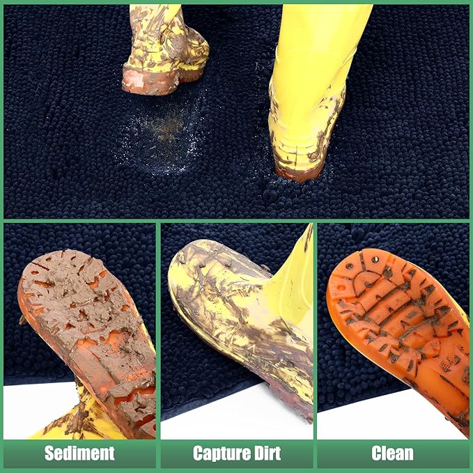 - [Powerful Dirt Scraping and Moisture Locking] This chenille doormat outperforms ordinary options in trapping dirt and moisture, stopping tracked-in mud, rainwater, and debris from ruining your floors. It shines even brighter in winter! Step on doormat, and the textured, dense surface instantly scrapes off dirt and snow from shoe soles, while absorbent fibers lock in moisture. Melting snow from boots is soaked up immediately—no slush puddles or slippery spots for kids, pets, or elders.