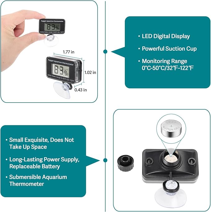 - LED THREE-DIGIT DISPLAY THERMOMETER:A high-precision temperature sensor is selected, which can display the temperature difference range to 0.1℉, and even small changes in water temperature can be felt. The sensing range of thermometer is from 0℃~50℃/32℉ - 122℉, meeting different needs for water temperature monitoring