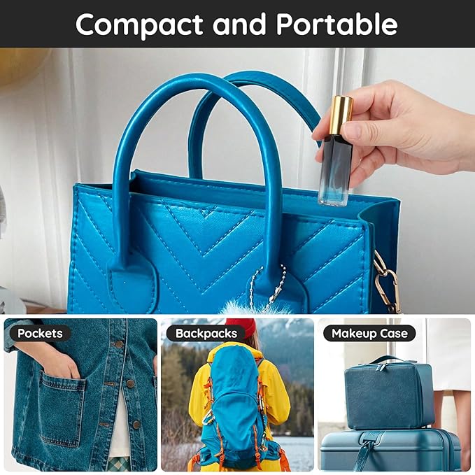 - 【Portable for Carrying】Set of 10 glass perfume bottles, each 10ML, measured 3.4x0.7in/8.7x1.8cm. Lightweight and portable, it is easy and convenient to store and carry out. Ideal for placing in your handbag or pocket, you could use it anytime, anywhere.