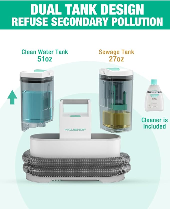- Double Tank Design for Easy Cleaning: The upholstery cleaner machine stores a 27 oz sewage tank and a 51 oz clean water tank separately and detachable, allowing you to fill, empty, and rinse them with ease. Experience enjoyable, uninterrupted cleaning and maintain a hygienic environment