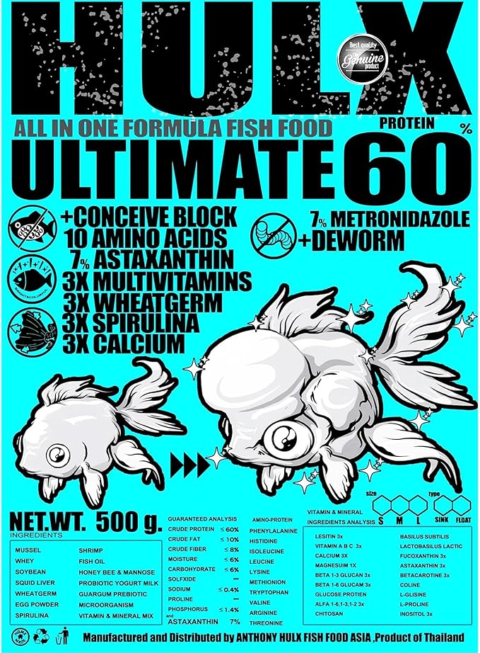 - HEALHY FISH FOOD: HULX You can see the difference in just 15 days of usage. From thin Body to Fat & Big Muscle Body, Good Health, Very Fast Growth up more 2 inch (5.5 cm.) in just 30 days. It enhances the color Beautifully & make them Shine.
