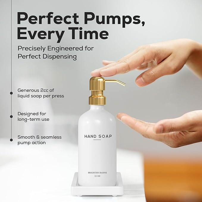 - AMERICAN DESIGN, UNCOMPROMISING QUALITY - Crafted with meticulous attention to detail, our glass soap dispenser with pump set features 2 robust 16oz glass bottles, corrosion-proof 304G stainless steel pumps, and a stain-resistant ceramic tray. All designed in the USA to provide unbeatable quality and enduring style that you can trust.