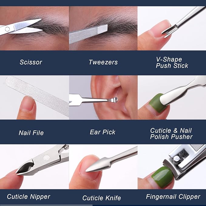 - 【FAMILIFE 11Pcs Manicure Kit】 FAMILIFE stainless steel manicure tools kit includes 11 tools, 1x Fingernail Clipper, 1x Toenail Clipper, 1x Cuticle Nipper, 1x Obtuse Push Broach, 1X Nail File, 1x Eyebrow Tweezers, 1x V-Shape Push Stick, 1x Ingrown Toenail Clipper, 1xBeauty Scissors, 1xCuticle Knife, 1xEar Pick, equipped with mens manicure pedicure set care tools for hands, feet, and face. And a portable blue leather case is included which is easy for you to travel.