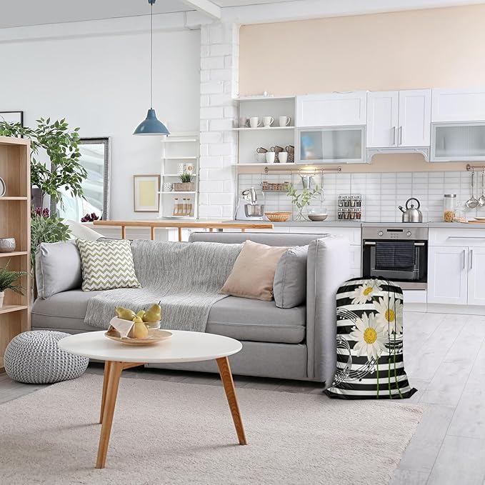 Swono Music Notes Storage Heavy Duty Basket Laundry Bag with Drawstring Daisies On Striped Bouquet Folding Organizer for Travel Washing Machine