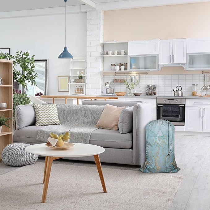 Swono Marble Stone Laundry Bag with Drawstring Closure, Foldable, Compact, Lightweight, 28" X 40" Blue Golden Liquid Lines Packable Dirty Clothes Pouch for College Dorm, Camp, Road Trip, Cruise or Gym