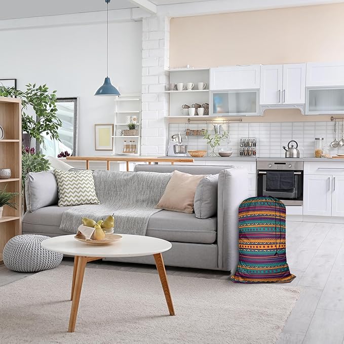 Swono Mexican Texture Heavy Duty Laundry Drawstring Bag with Strap, Indian Style Hand Drawn Abstract Backdrop 28 x 40 Inches Travel Dirty Clothes Bag for Laundromat and Household