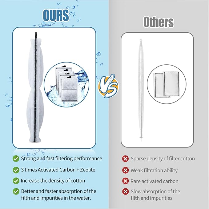 - Excellent Filtration Performance - The filter cartridges is made of high density cotton + 50% more nutshell activated carbon + zeolite, which has 4-layer filtering effect to filter and absorb 99% of the impurities, especially absorb ammonia and nitrogen in the water. So as to keep the water source clean and the healthy growth of fish.