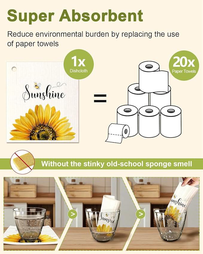 6 Pack Swedish Dishcloths for Kitchen - Reusable Dish Cloths for Washing Dishes Absorbent Cute Funny Kitchen Towels Cleaning Sponge, Sunflower