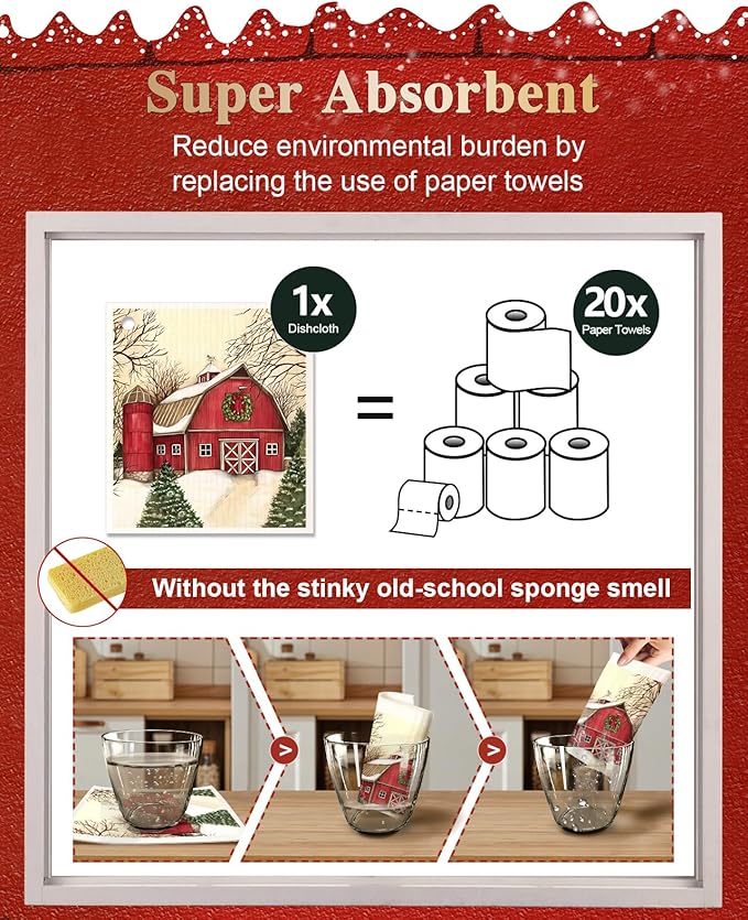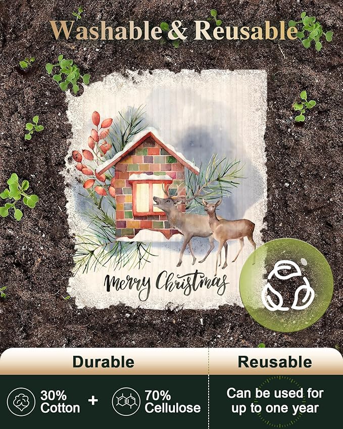 - REUSABLE: Our reusable Swedish dishcloths, made of 30% cotton and 70% cellulose, are fast-drying and super absorbent. They are ideal for multiple cleaning projects around the kitchen and house. The winter-themed designs and holiday-inspired patterns make cleaning tasks festive and enjoyable