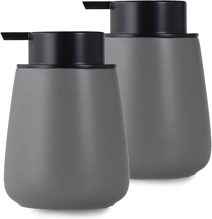 12Oz Grey Soap Dispenser Set - Ceramic Lotion Hand Soap Dispenser Set with Easy-to-Press Black Pump, Refillable Mordern Liquid Dish Soap Dispensers for Bathroom & Kitchen, 2 Pack
