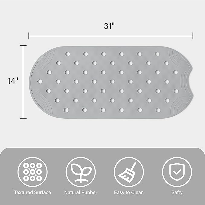 Rubber Bathtub Mat Shower Mat Non-Slip, 31x14 Inch, Bath Tub Floor Mat with Suction Cups and Drainage Holes, Grey