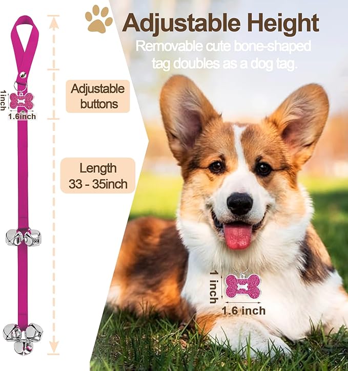 - 🔔Adjustable Length: The training bell has a strong buckle that can hang from nearly any doorknobs or handles. You can easily adjust the length between 33'' and 35'' and make it suitable for your dog friends to ring the bell.